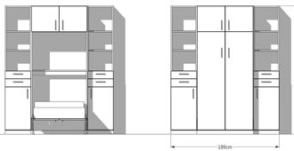 Regale, Vitrinen und Schränke bieten jede Menge Platz und machen das Verstauen Ihrer Utensilien einfach und unkompliziert. Das Wandbett wird optimal in diese Wohnlandschaft eingepasst und bildet einen unsichtbaren Teil der Wohnwand.